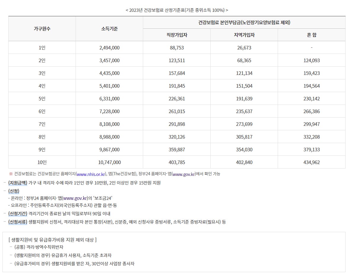 2023년 건강보험료 산정기준표를 확인하시고 본인이 지원대상에 해당하는지 확인하실 수 있습니다.